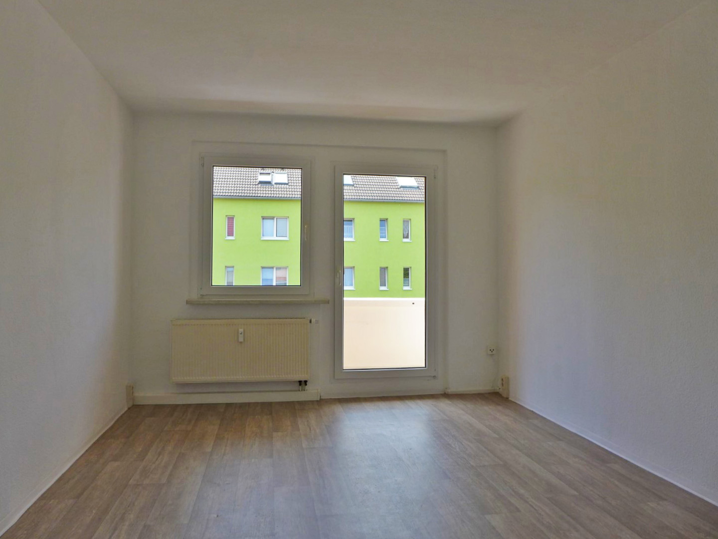 Die gut geschnittene 3-Raum-Wohnung verfügt über ein Wohnzimmer mit einem nach Süden ausgerichteten großen Balkon, der auch übers Kinderzimmer reicht, ein vom Wohnzimmer aus erreichbares Schlafzimmer, ein Kinderzimmer, ein Bad mit Wanne und Fenster, eine Küche mit Fenster und einen Flur. Zur Wohnung gehört ein Keller. Die Anschlüsse für die Waschmaschine befinden sich im Bad zwischen Fenster und Toilette.